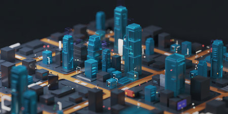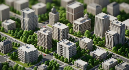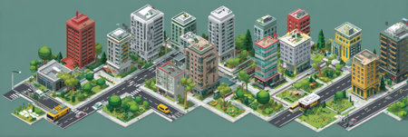 Isometric view of urban infrastructure highlighting organized buildings, roads, and green spaces in a clean layout.