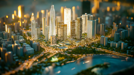 An intricate miniature city model glows with warm, golden lights at night. The tilt-shift perspective and shallow depth of field create a dreamy, magical diorama of urban life.