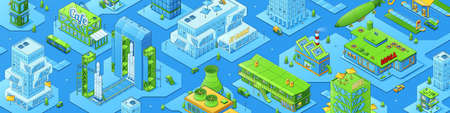 Isometric city infrastructure, megalopolis industrial and urban architecture buildings, transport refueling station, plant, spaceport, it park, hotel, mall, cafe, cars, 3d vector line art illustration