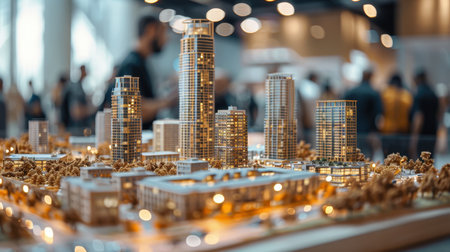 A detailed miniature model of a cityscape displayed on a table at an exhibition, with a blurred background of people and lights