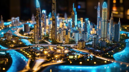 This image features an intricate architectural model of a modern urban skyline illuminated at night, showcasing towering skyscrapers and detailed landscaping.