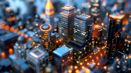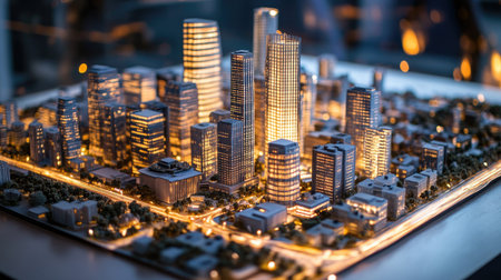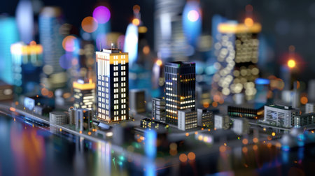 A stunning miniature city model captures the essence of modern architecture illuminated beautifully at night, showcasing vibrant lights and intricate designs.