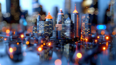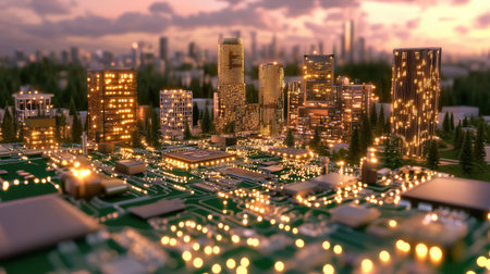 A miniature city built on a circuit board, symbolizing the interconnectedness of technology and urban life. Vibrant lights illuminate the scene.