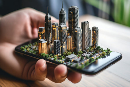Miniature model of the city on the mobile phone in the hand.