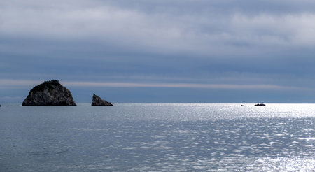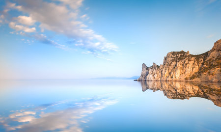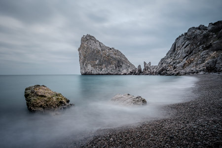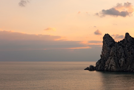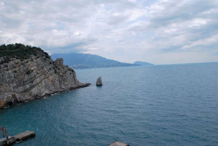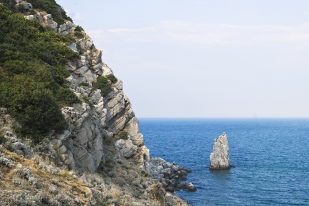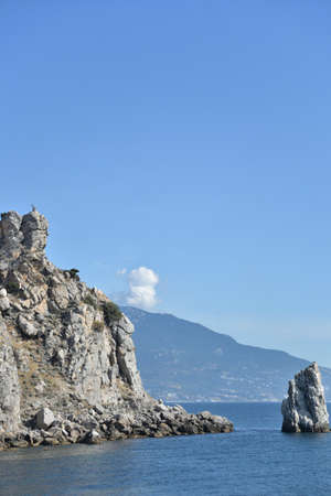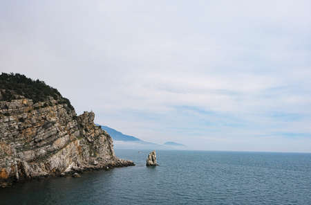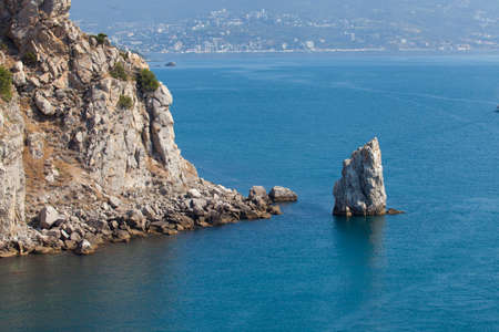 Seascape. Rock Sail in Gaspra, Crimea. Outlier rock in the sea.