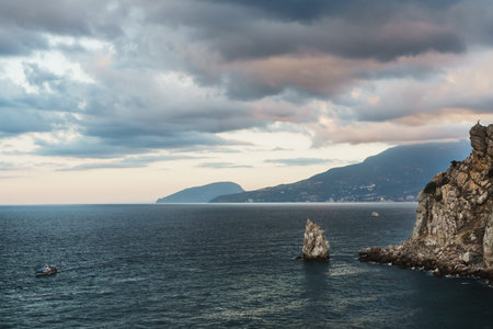 Coastal seascape landscape with Mount Cat or Koshka from rock Diva on cloudy weather dayin spring. Simeiz, Crimea