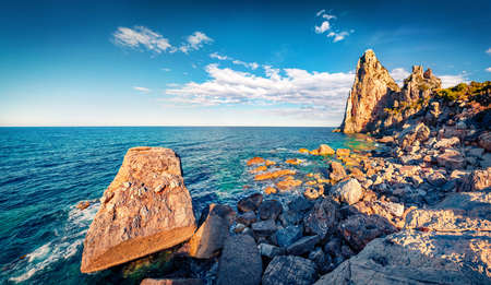Bright blue color Black sea shore of Crimea peninsula with high cliff on the cost. Paradise stone beach.