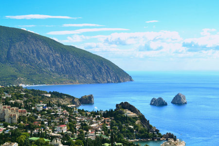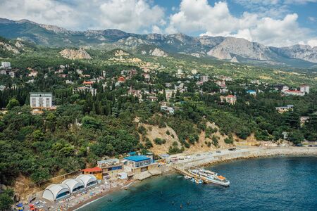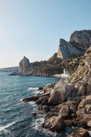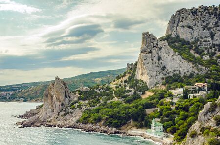 Sea view with rocky beaches and cliffs. Tourism in the Crimea. Summer photo of a sea landscape. Crimean Mountains and sea near town of Alupka, Crimea.