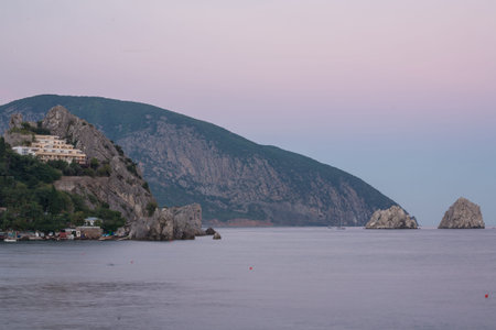 Hurzuf, Crimea, Russia-05.05.2019: Holiday home in Gurzuf rocks against the backdrop of mount Ayu-Dag early in the morning. Black sea, tourist resort