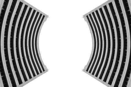 An overhead view displays a symmetric architectural composition. The image showcases repeating staircases and structures set against a white background. It exhibits a monochrome color scheme with geometric shapes and lines. This design could be useful for various commercial applications, including architectural visualizations or abstract artwork.