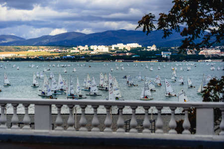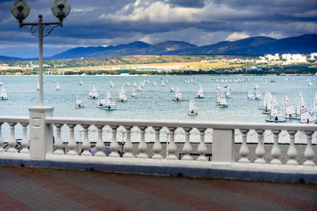 White sails of yachts at sea, youth yacht regatta. In the foreground there is an embankment and a white balustrade. There are mountains and buildings in the background. Autumn sky, gloomy clouds. Gelendzhik, Black Sea