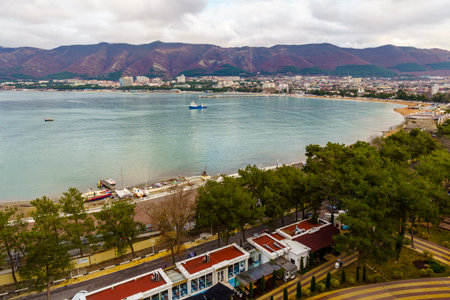 Panorama of Gelendzhik resort. Gelendzhik Bay and Caucasus Mountains. In foreground of residential complex Gardens of the Seas