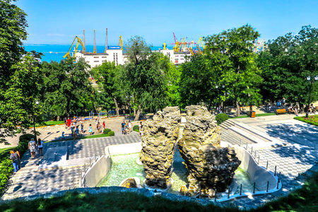 Odessa Istanbul Park Stairs Descent with Stone Fountain and Seascape View
