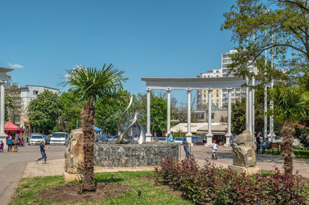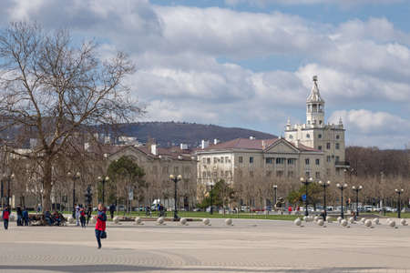 Novorossiysk, Russia - March 25: Phorumnaya square and residential house in Novorossiysk on March 25, 2019 in Novorossiysk, Russia.