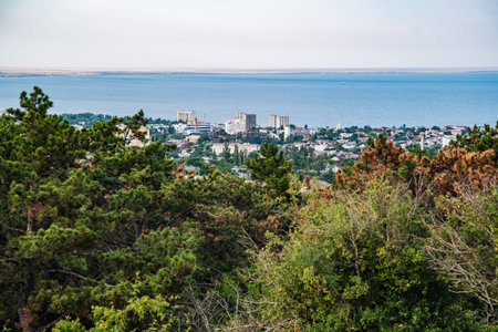Kerch August 21, 2021 View of the city of Kerch from the observation deck on Mount Mithridat. Houses, trees, Black and Azov seas, seaport. Cove and opposite shore with horizon. Summer evening