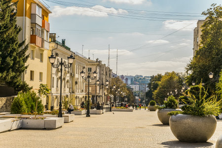 Belgorod, Russia - September 29, 2017: Street of the fiftieth anniversary of the Belgorod region. Pedestrian street in the old residential center of the city. City environment