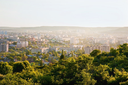 European little city view, cityscape. View on little old colorful buildings in historic centre of Chortkiv city, Ukraine. Exploring Europe