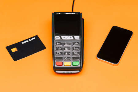 Payment terminal for purchases, mobile phone and bank card. Contactless payment methods. E-commerce. Business and technology. Top view, flat lay
