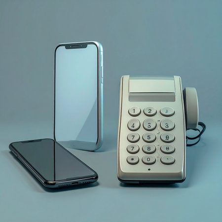 A visual metaphor for technological progress, this image places a classic push-button telephone next to a sleek, modern smartphone.