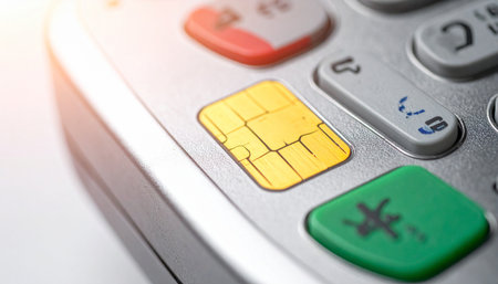 A close-up view highlights the gold chip reader on a sleek payment terminal, symbolizing the speed and security of modern digital transactions.