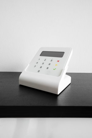 Credit card reader machine on white table. Credit card payment concept.