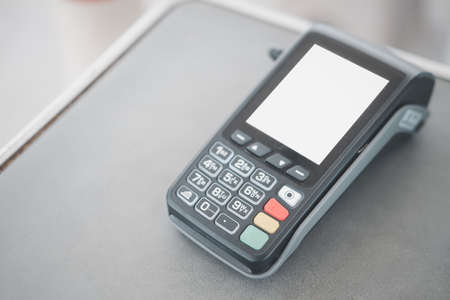 Payment for purchases with credit card. Payment pos terminal top view