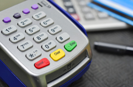Credit card machine for pay on blurred background