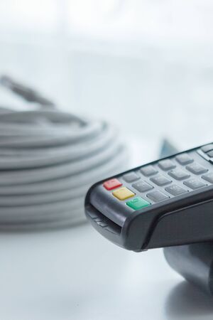 card payment terminal, on background the wires