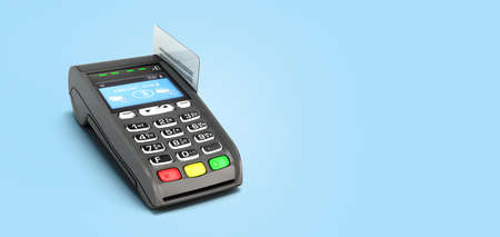 Payment terminal with credit card on blue background with copy space