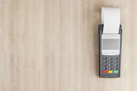 POS terminal isolated on wooden background, copy space.Terminal cash register machine for contactless payment with credit card. Banking equipment, NFC.