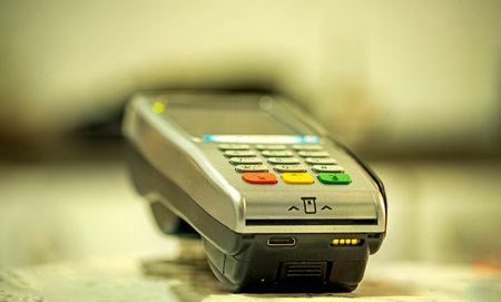Pos terminal in the shop. Ready for work, Close view