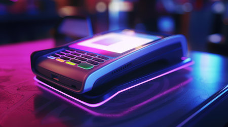Modern nfc reader with glowing lights processes contactless payments. the sleek design and clean lines are highlighted by ambient soft lighting, emphasizing its cutting-edge technology and user-friendly interface for retail environments.