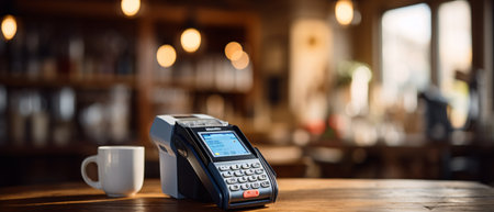 Payment terminal alongside smartphone on a rustic wooden table in a stylish cafe showcasing modern transaction capabilities and customer convenience