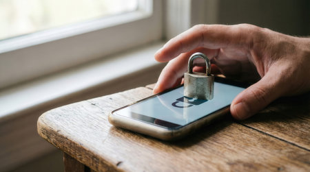 A vpn privacy safety smartphone secure browsing concept padlock hand window table wood lock screen protection