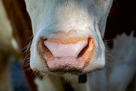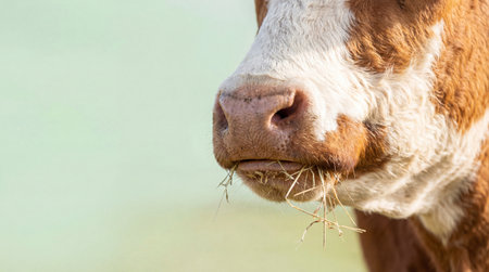 Cow muzzle chewing dry hay on sunny pasture with close up detail of nose, mouth, whiskers, and soft natural background.