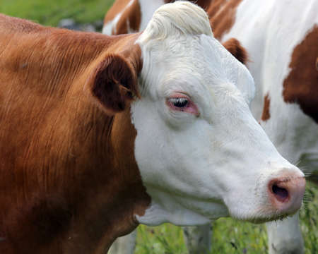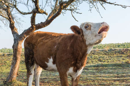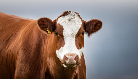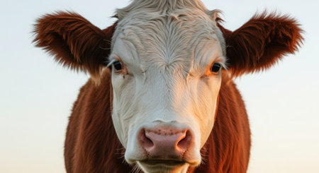 Young Chandler Herefords cow Portrait. Brown and white paint cow. Cute Orange cow with white head