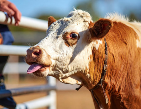 Portrait of milking brown and white Holstein cow at agricultural animal exhibition, cattle trade show: close up side view. Farming, care, agriculture industry and animal husbandry concept