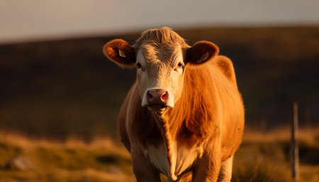 Cute cow grazing in green meadow at sunset on farm generated by artificial intelligence