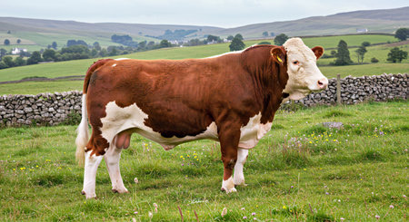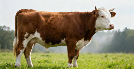 Side profile of a brown and white hereford steer in a farm field in springtime