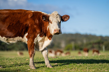 Nature, livestock and cows on a farm in countryside for eco friendly agriculture environment. Sustainable, animals and herd of cattle for meat, dairy or beef trade production industry in grass field.