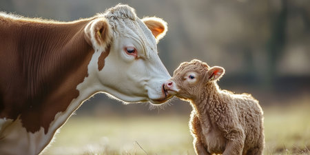 A serene scene featuring a cow and her calf standing together in a rustic barn. The soft natural light highlights their features, creating a warm atmosphere.