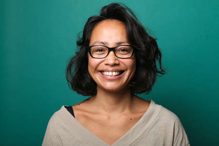 A woman stands against a green wall with a serious expression on her face. Her long hair is styled neatly. The background adds a simple touch to her appearance.