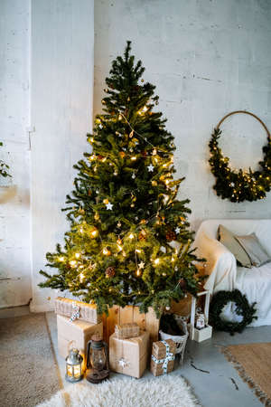 Christmas tree with decorations and gifts interior of the house new holiday white