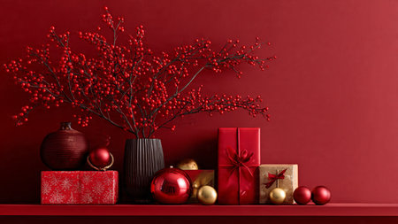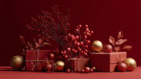 Elegant top-view red background enhanced with glittery snowflake pieces and high-end wrapping paper.