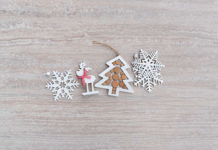 Various wooden Christmas ornaments, golden baubles and pine cones on wooden background. Selective focus.