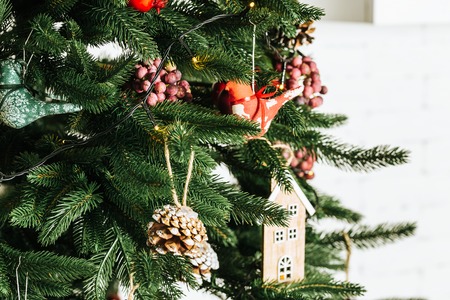 Christmas toys, garlands and glass balls on a new year tree branches close-up.