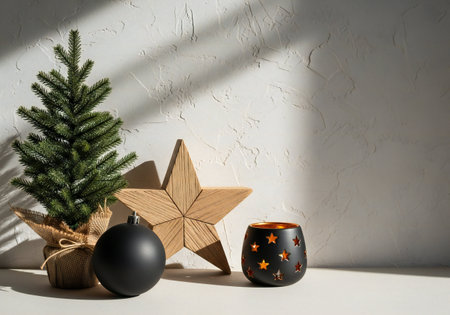 Christmas tree and festive ornaments on office desk used for holiday celebration during winter season. Empty space filled with seasonal decorations for xmas festivity tradition and event. Close up.