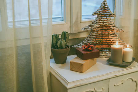 New Years holiday, Christmas canoon at home with a Christmas tree, candles, postcards, handouts, gifts, present, boxes