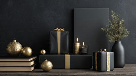 A sleek monochrome black setup enhanced with subtle gold ornament pops.