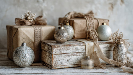 Soft festive arrangement featuring brushed silver textures and pale green accents.